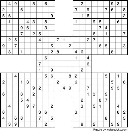 Instructions: Complete each of the five intersecting 9x9 puzzles just like a regular Sudoku.