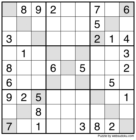 Instructions: Complete Sudoku-X like a regular Sudoku, but with no repeats in the shaded diagonals.